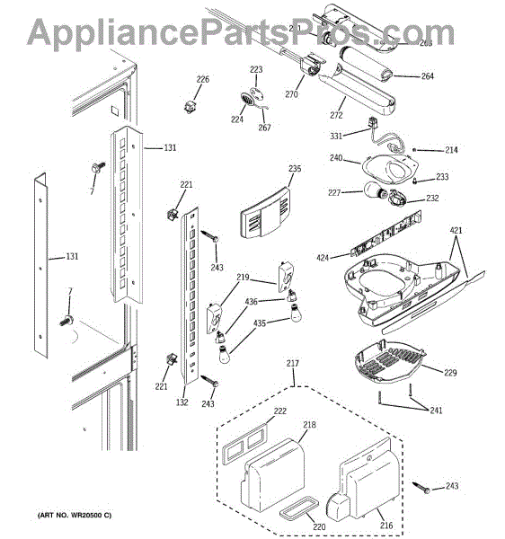 Over time, the water filter housing and tube assembly can become damaged due to regular use, exposure to high water pressure, or mineral deposits building up inside the tubes. Such damage may lead to leaks or reduced water flow, affecting the performance of the refrigerator's water and ice systems.