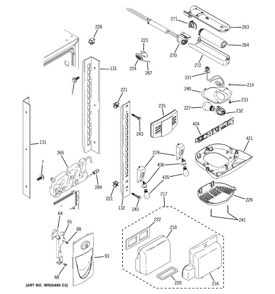 Side track rail for refrigerator shelves. Mounts inside the fresh food compartment to guide sliding shelves. Replace if cracked, broken, or missing.