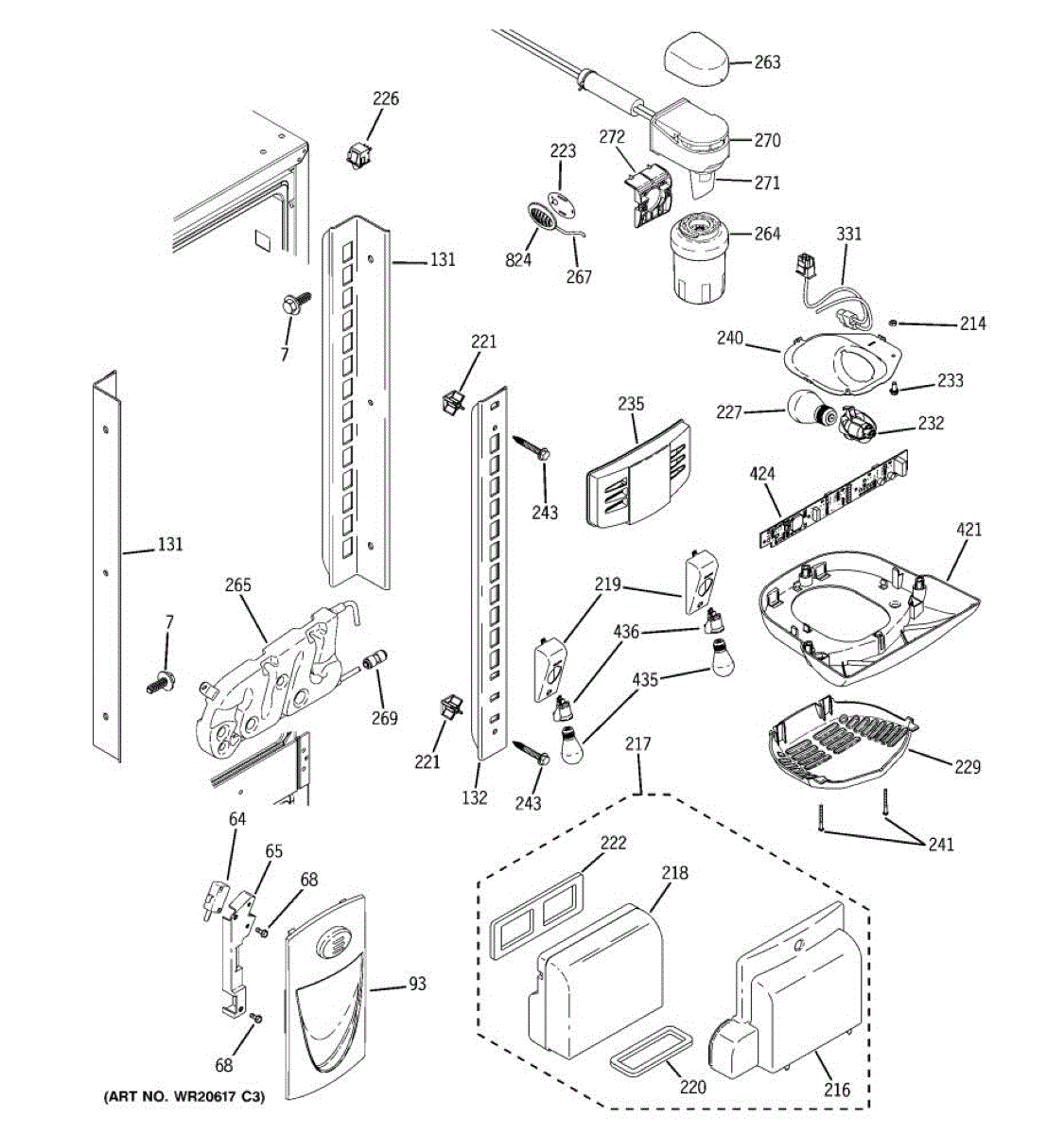 Houses the water filter and connects to the water supply line. Replace if water leaks, sprays during filter changes, or dispenser flow decreases. Verify model fit.