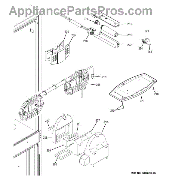 Over time, the water filter housing and tube assembly can become damaged due to regular use, exposure to high water pressure, or mineral deposits building up inside the tubes. Such damage may lead to leaks or reduced water flow, affecting the performance of the refrigerator's water and ice systems.