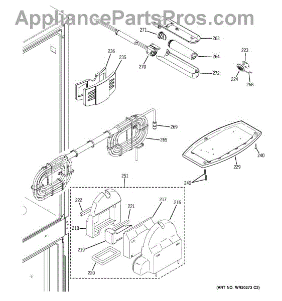 Over time, the water filter housing and tube assembly can become damaged due to regular use, exposure to high water pressure, or mineral deposits building up inside the tubes. Such damage may lead to leaks or reduced water flow, affecting the performance of the refrigerator's water and ice systems.