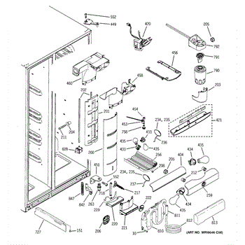 This air diverter is a duct component that directs and balances airflow inside the refrigerator. Replacing a cracked or missing diverter helps restore proper cooling performance and reduce frost or condensation around air passages.
