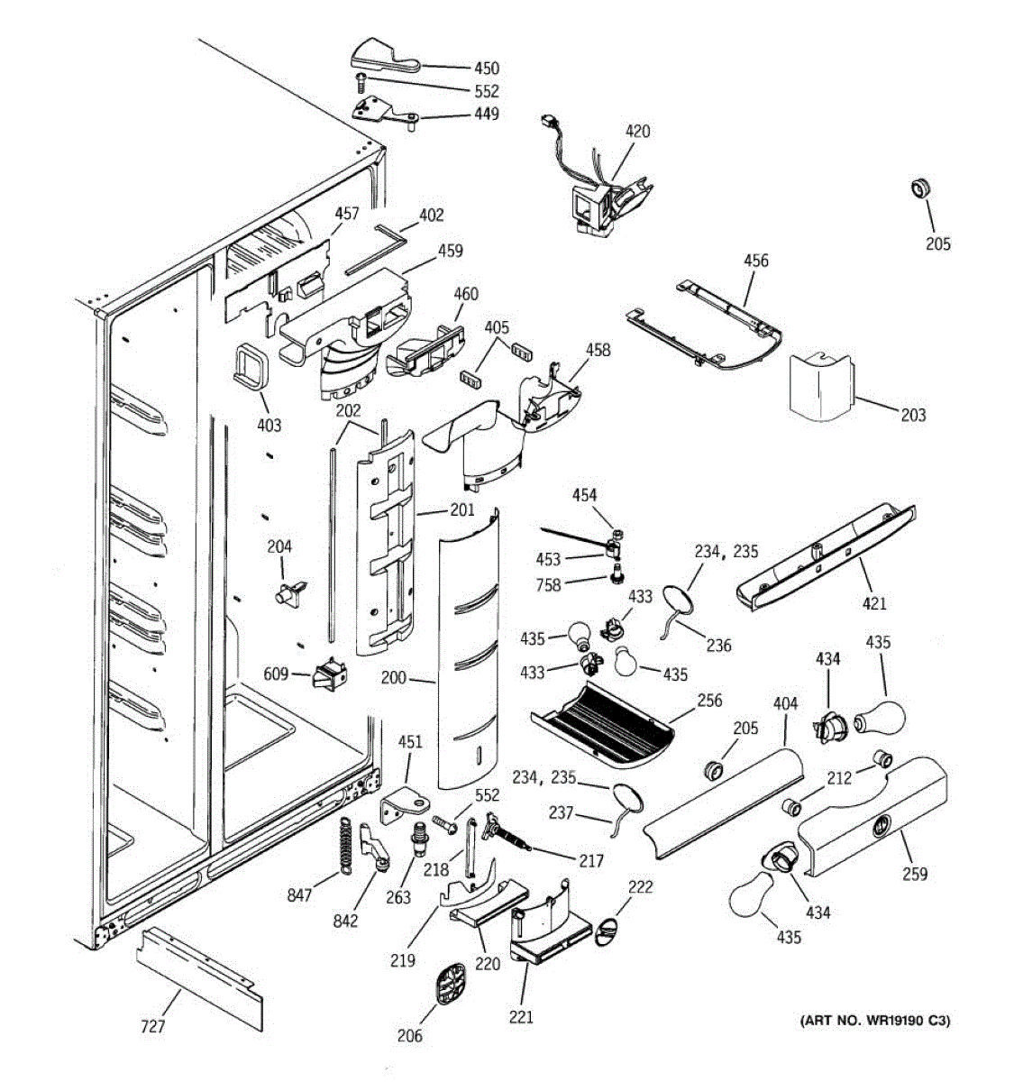This air diverter is a duct component that directs and balances airflow inside the refrigerator. Replacing a cracked or missing diverter helps restore proper cooling performance and reduce frost or condensation around air passages.
