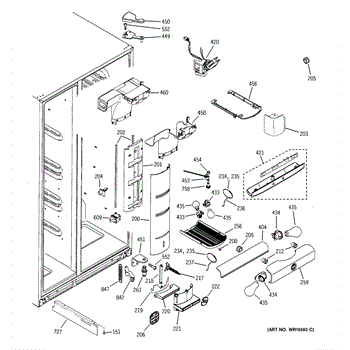 This air diverter is a duct component that directs and balances airflow inside the refrigerator. Replacing a cracked or missing diverter helps restore proper cooling performance and reduce frost or condensation around air passages.