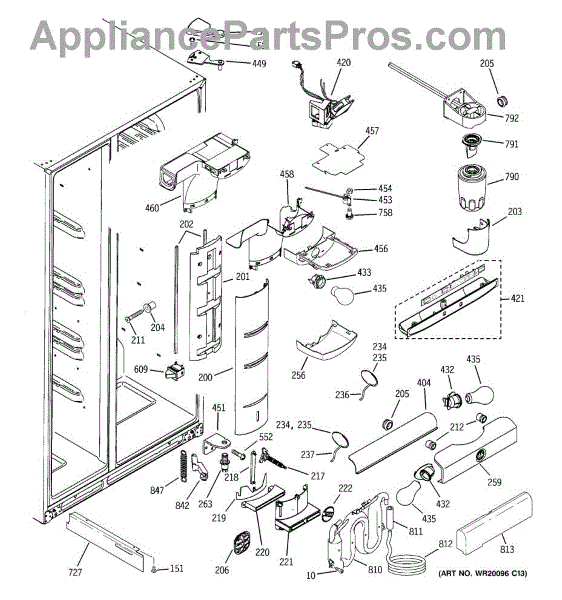 This air diverter is a duct component that directs and balances airflow inside the refrigerator. Replacing a cracked or missing diverter helps restore proper cooling performance and reduce frost or condensation around air passages.