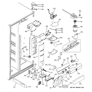 This air diverter is a duct component that directs and balances airflow inside the refrigerator. Replacing a cracked or missing diverter helps restore proper cooling performance and reduce frost or condensation around air passages.