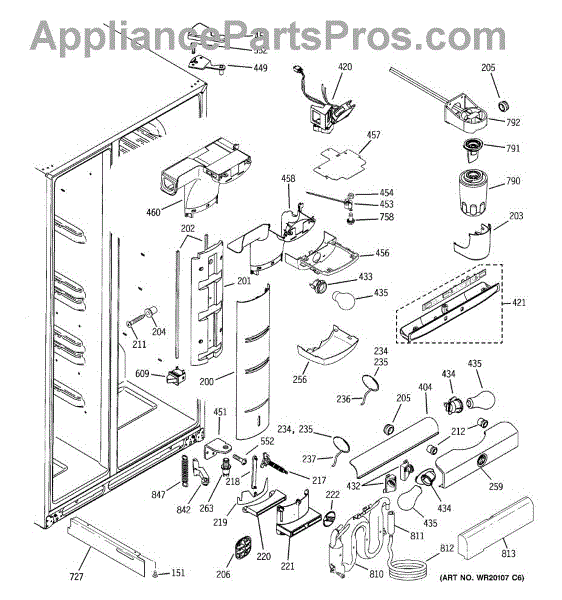 This air diverter is a duct component that directs and balances airflow inside the refrigerator. Replacing a cracked or missing diverter helps restore proper cooling performance and reduce frost or condensation around air passages.