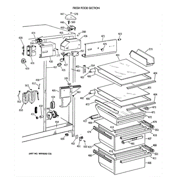 This left-hand drawer slide assembly mounts inside the refrigerator's fresh food section. It supports the shelf/cover and guides the drawer on its track, restoring smooth operation and proper alignment when the original rail is cracked or worn.