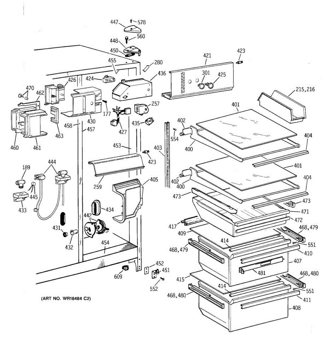 This left-hand drawer slide assembly mounts inside the refrigerator's fresh food section. It supports the shelf/cover and guides the drawer on its track, restoring smooth operation and proper alignment when the original rail is cracked or worn.