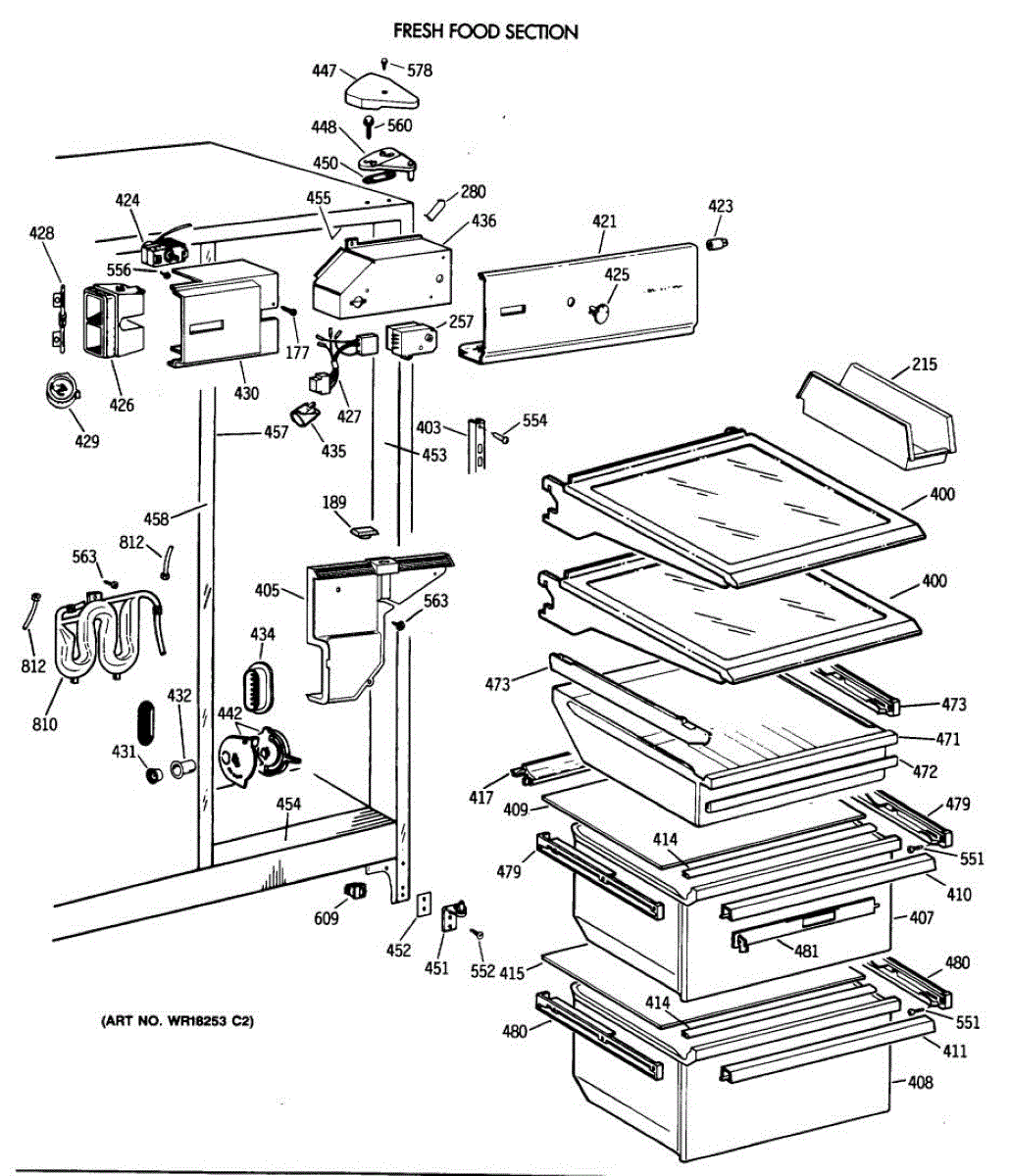 This left-hand drawer slide assembly mounts inside the refrigerator's fresh food section. It supports the shelf/cover and guides the drawer on its track, restoring smooth operation and proper alignment when the original rail is cracked or worn.