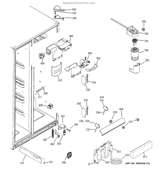 The Door Closure Spring is an OEM replacement part for GE refrigerators. It provides balanced tension to assist the door hinges and latch mechanism in securely closing the refrigerator door. The spring helps the door shut fully while preventing it from slamming closed abruptly.