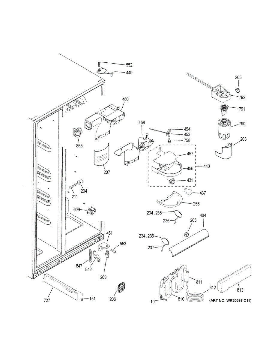 Molded duct assembly directs cold air from freezer to fresh-food section. Replace if cracked, broken, or damaged to restore proper airflow balance.