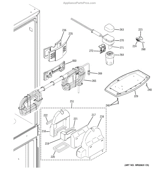 The GE Refrigerator Water Filter Housing and Tube Assembly is an OEM part for GE refrigerators. It houses the water filter and connects it to the water supply line, ensuring clean and filtered water is dispensed.