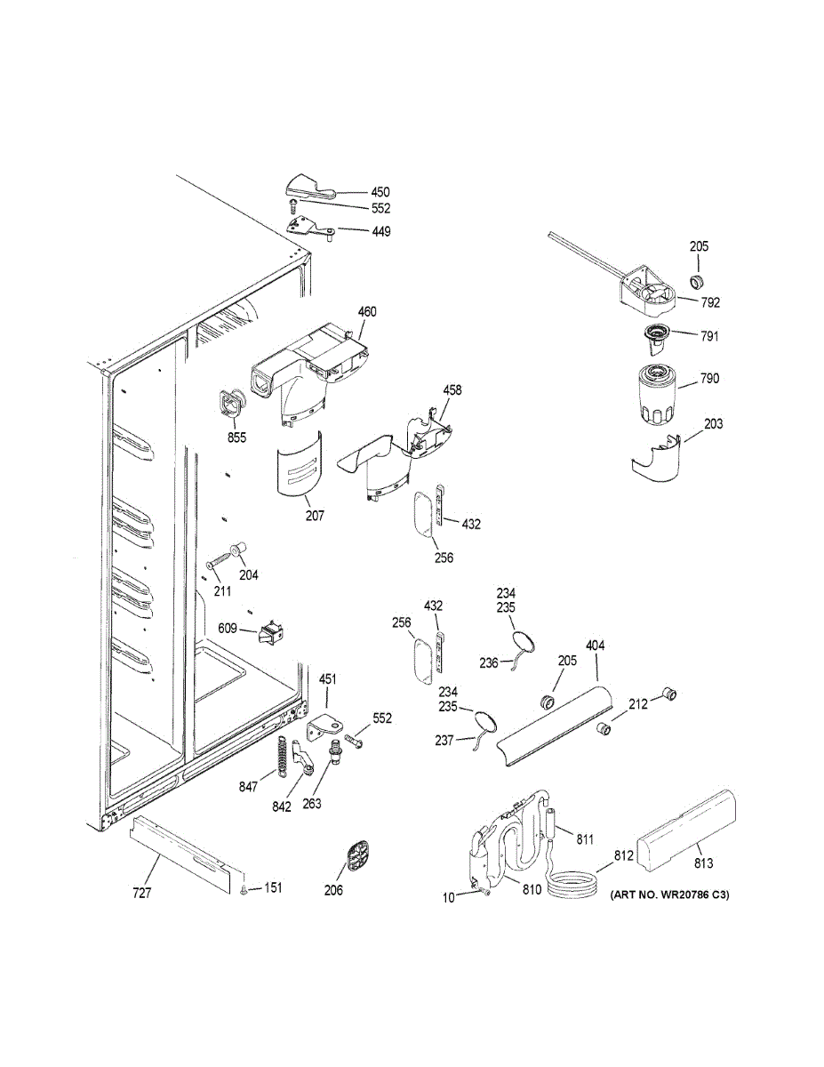 Molded duct assembly directs cold air from freezer to fresh-food section. Replace if cracked, broken, or damaged to restore proper airflow balance.