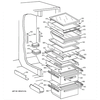 Cantilever shelf for side-by-side refrigerators. Replaces cracked, broken, or damaged shelving. Slides out for easy access to stored items.