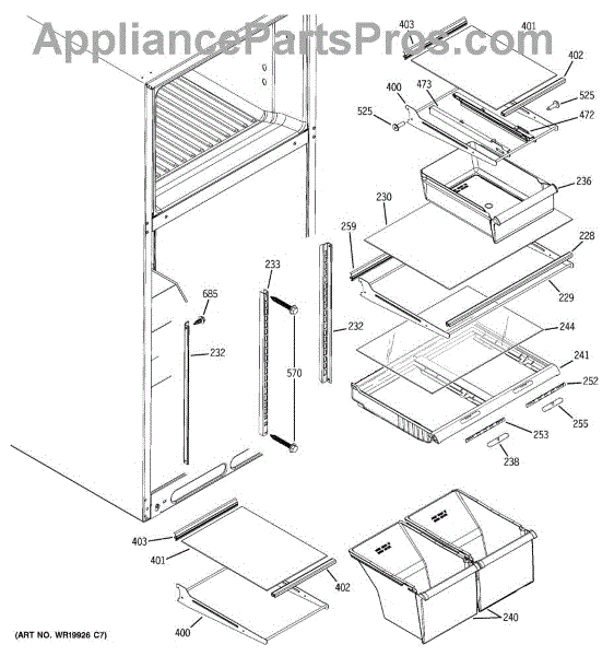 Cantilever side track for refrigerator shelves. Installs on interior wall to support sliding shelf mechanism. Replace if cracked, broken, or worn.