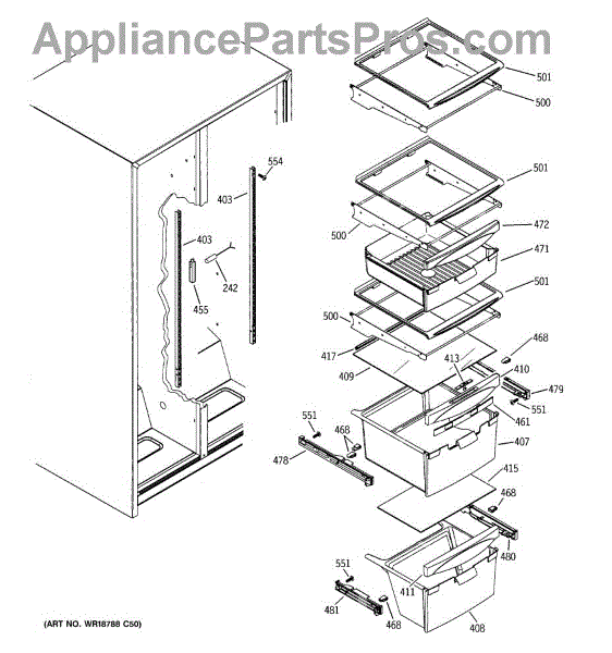 Right-hand drawer slide assembly for refrigerator crisper and meat pan drawers. Replace if cracked, broken, or causing drawers to sag or drop.