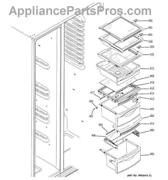 The Drawer Cover is an OEM replacement part for select GE refrigerator vegetable and deli drawers. It protects stored contents from dehydration, contaminants and prolonged illumination while keeping the drawers light-sealed. Proper drawer insulation optimizes food storage conditions. Causes of a bad drawer cover can include cracks and breaks from repeated drawer opening/closing stresses over time. Exposure to produce acids and moisture accelerates degradation of plastic sealing surfaces. Symptoms include: