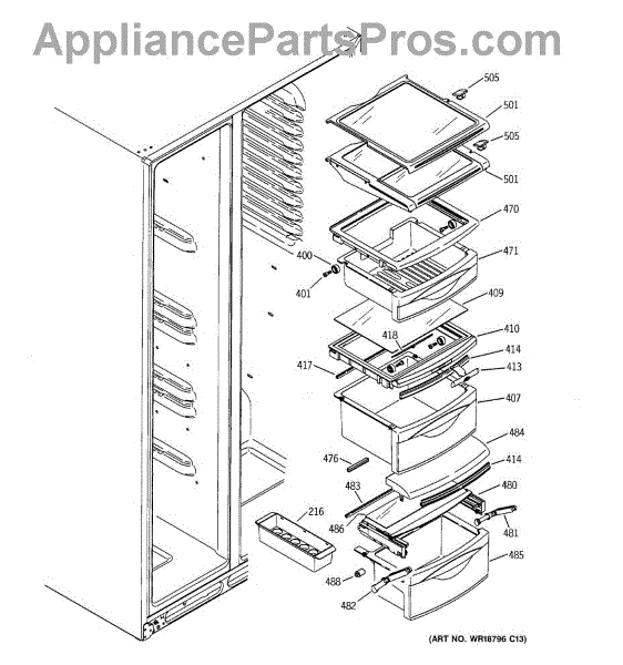 The Drawer Cover is an OEM replacement part for select GE refrigerator vegetable and deli drawers. It protects stored contents from dehydration, contaminants and prolonged illumination while keeping the drawers light-sealed. Proper drawer insulation optimizes food storage conditions. Causes of a bad drawer cover can include cracks and breaks from repeated drawer opening/closing stresses over time. Exposure to produce acids and moisture accelerates degradation of plastic sealing surfaces. Symptoms include: