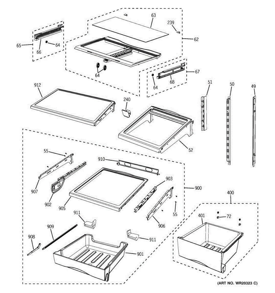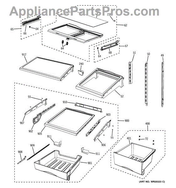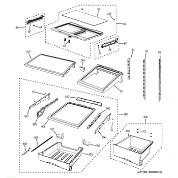 Glass shelf assembly that covers the vegetable crisper drawer. Replacement needed when the glass cracks, shatters, or the plastic frame breaks or snaps.