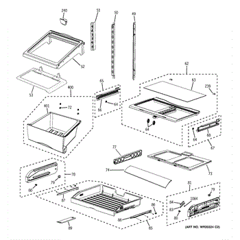 The ASM Cover Veg Pan is an OEM part for GE refrigerators. It serves as a cover for the vegetable crisper drawer, helping to maintain the freshness of stored produce by providing a controlled environment. This cover supports the shelf above the crisper and can also act as an additional storage surface.