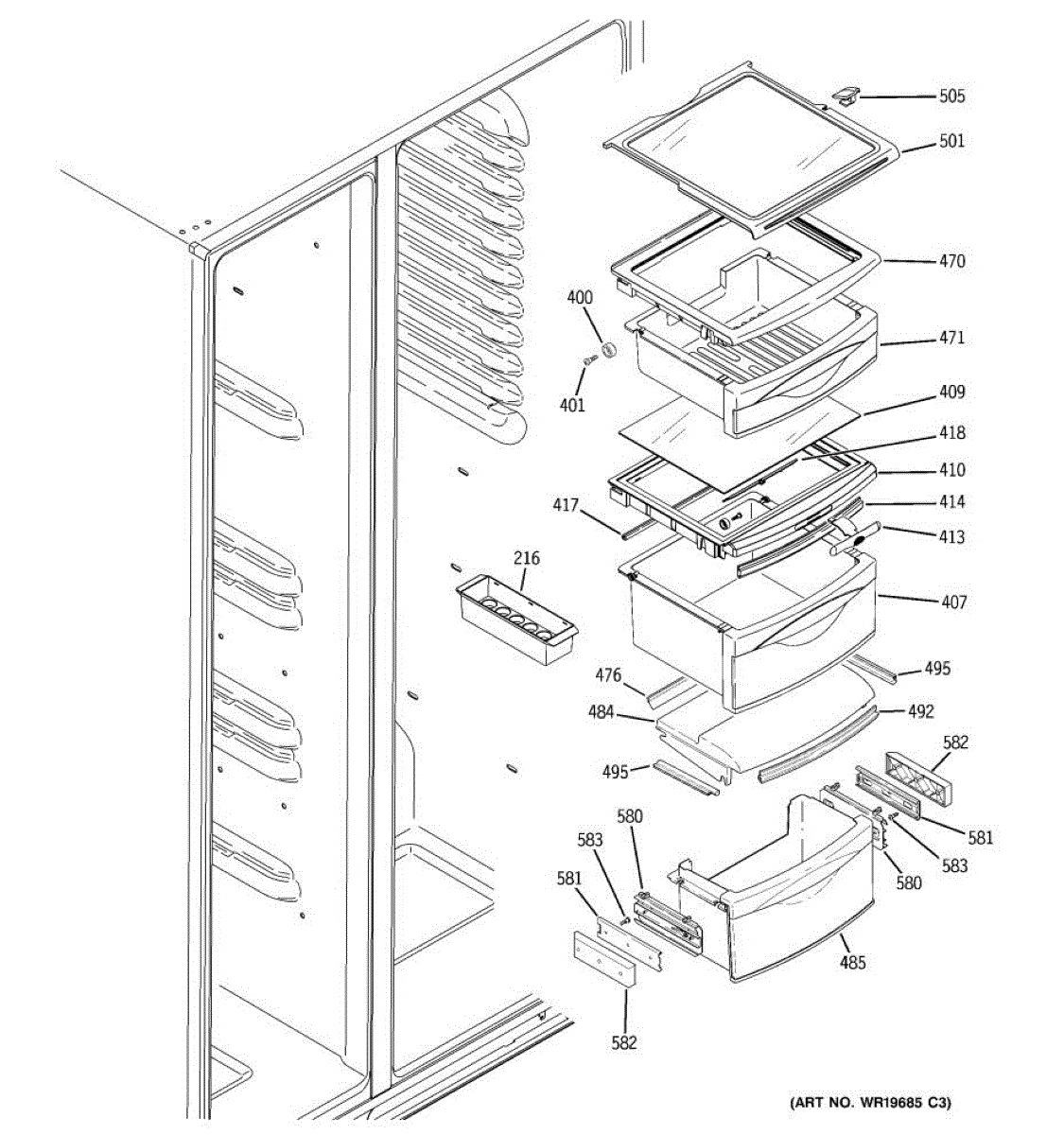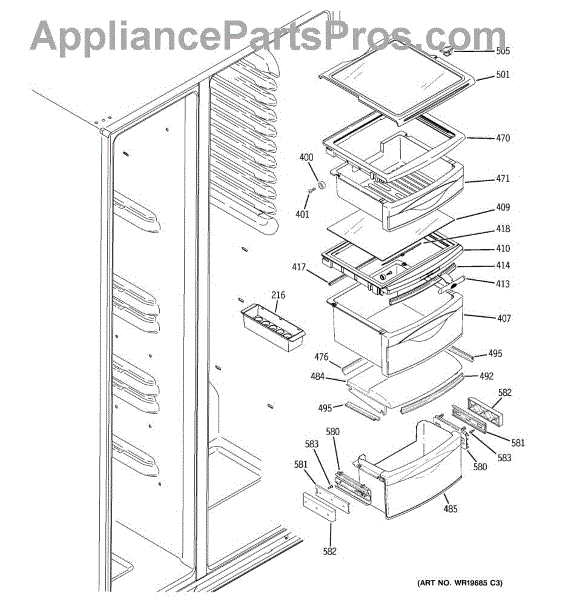 Covers the evaporator area and collects defrost water in your side-by-side refrigerator. Replace if cracked, broken, or missing to prevent leaks.