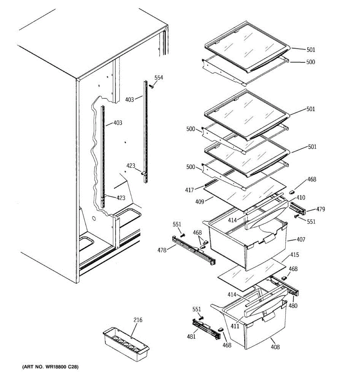 Right-hand drawer slide assembly for refrigerator crisper and meat pan drawers. Replace if cracked, broken, or causing drawers to sag or drop.