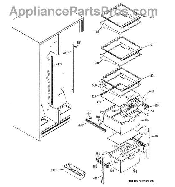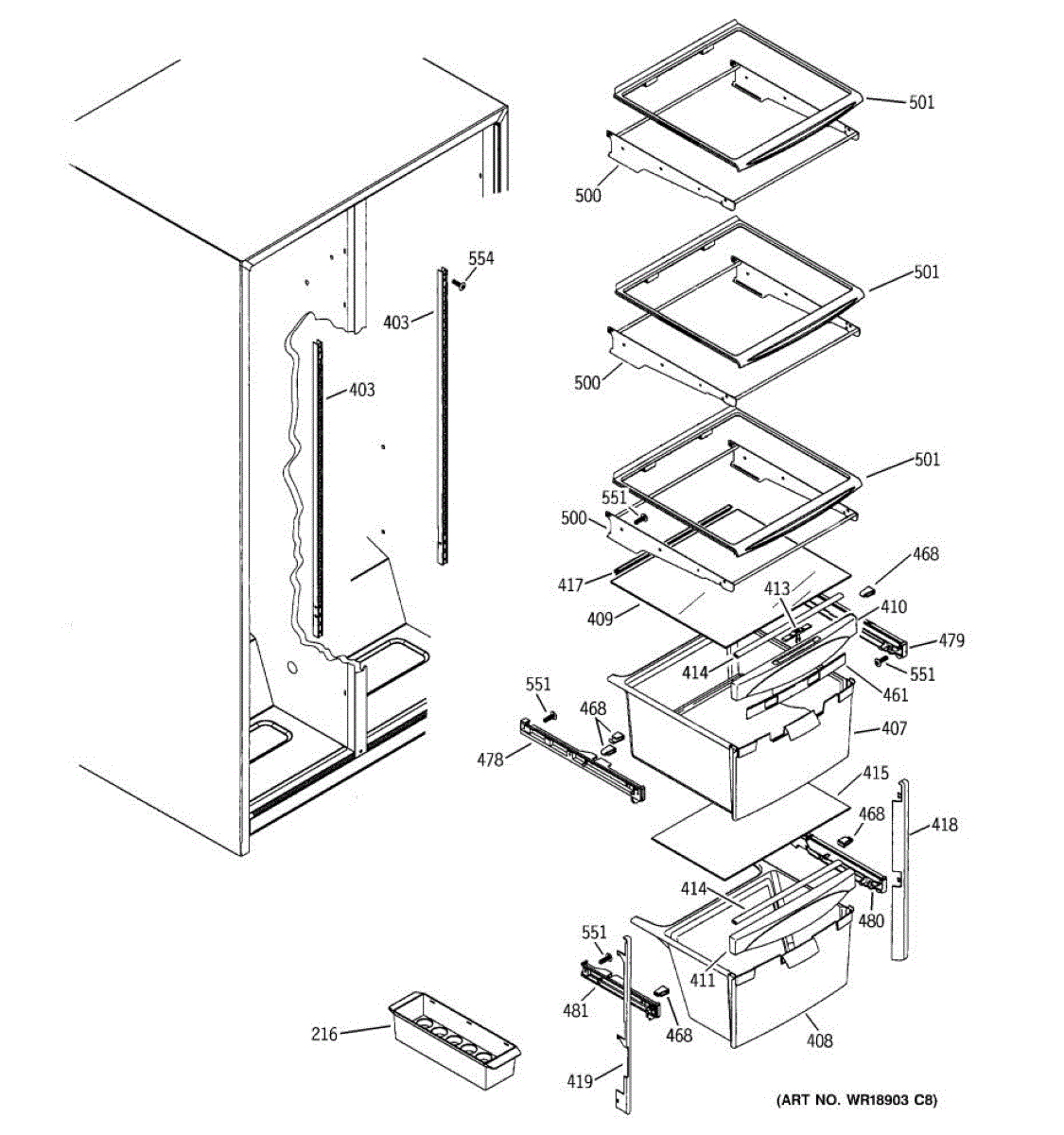 Cantilever shelf track for refrigerators. Mounts to the interior wall to support adjustable shelving. Replace if cracked, broken, or damaged.