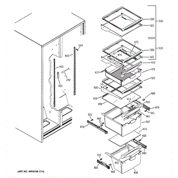 Right-hand drawer slide assembly for refrigerator crisper and meat pan drawers. Replace if cracked, broken, or causing drawers to sag or drop.