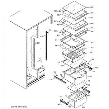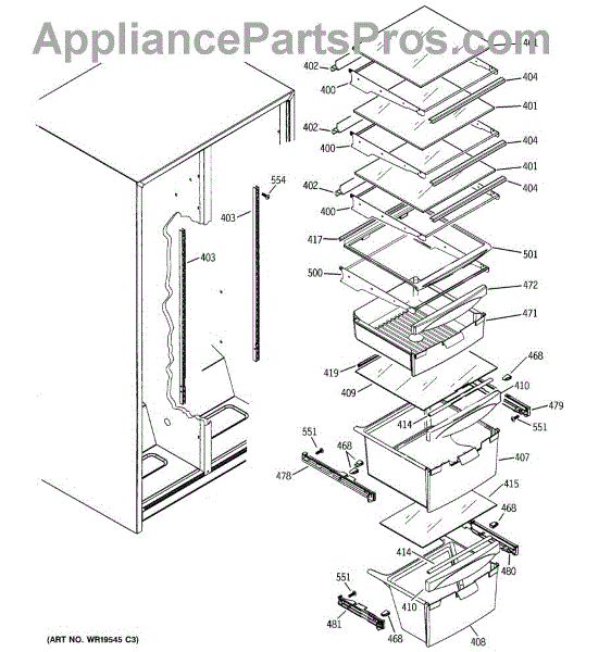 Right-hand drawer slide assembly for refrigerator crisper and meat pan drawers. Replace if cracked, broken, or causing drawers to sag or drop.
