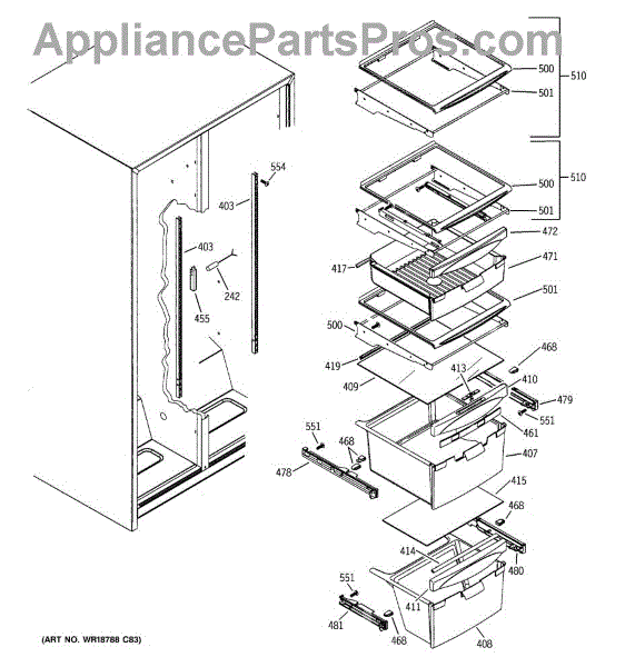 Right-hand drawer slide assembly for refrigerator crisper and meat pan drawers. Replace if cracked, broken, or causing drawers to sag or drop.
