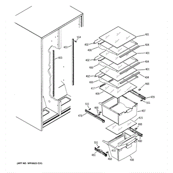 Cantilever shelf track for refrigerators. Mounts to the interior wall to support adjustable shelving. Replace if cracked, broken, or damaged.