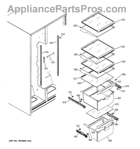 Cantilever shelf track for refrigerators. Mounts to the interior wall to support adjustable shelving. Replace if cracked, broken, or damaged.