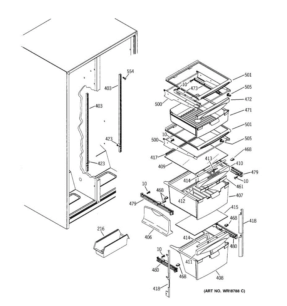 Cantilever shelf track for refrigerators. Mounts to the interior wall to support adjustable shelving. Replace if cracked, broken, or damaged.