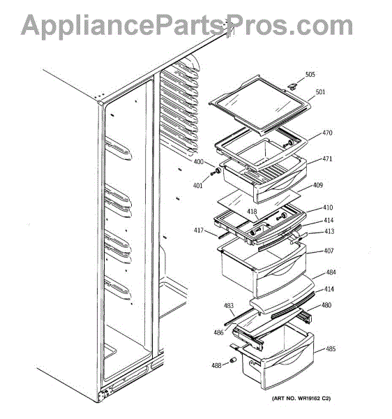 The Drawer Cover is an OEM replacement part for select GE refrigerator vegetable and deli drawers. It protects stored contents from dehydration, contaminants and prolonged illumination while keeping the drawers light-sealed. Proper drawer insulation optimizes food storage conditions. Causes of a bad drawer cover can include cracks and breaks from repeated drawer opening/closing stresses over time. Exposure to produce acids and moisture accelerates degradation of plastic sealing surfaces. Symptoms include: