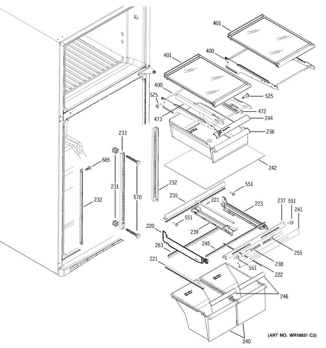 Cantilever side track for refrigerator shelves. Installs on interior wall to support sliding shelf mechanism. Replace if cracked, broken, or worn.