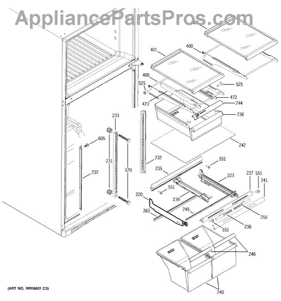 Left side slide rail for refrigerator snack pan or crisper drawer. Replace if broken, cracked, or damaged to restore smooth drawer operation. Sold individually.