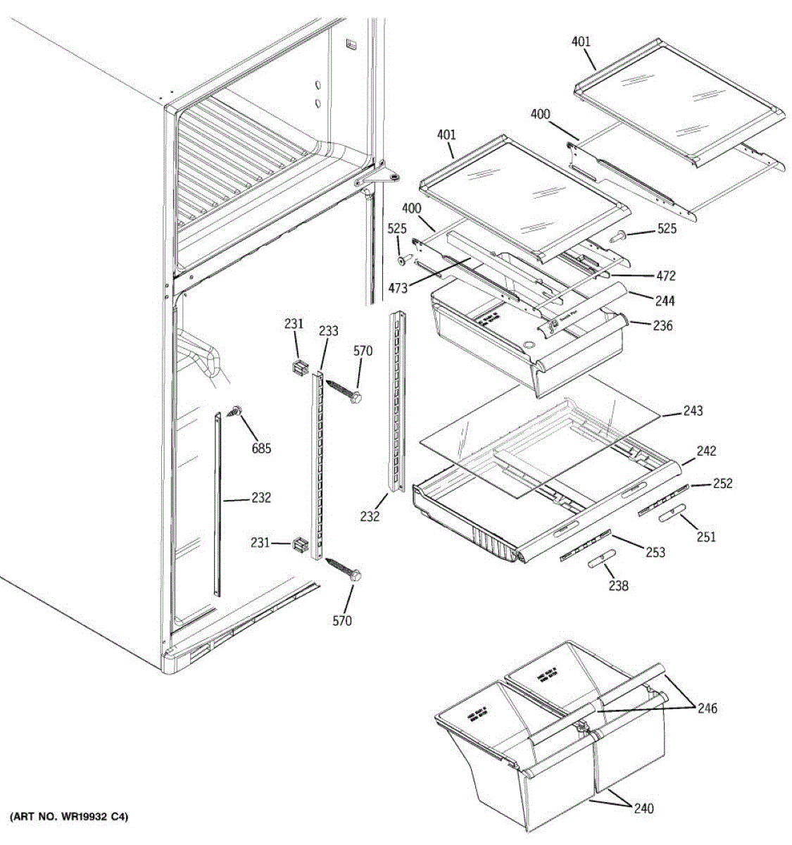 Cantilever side track for refrigerator shelves. Installs on interior wall to support sliding shelf mechanism. Replace if cracked, broken, or worn.