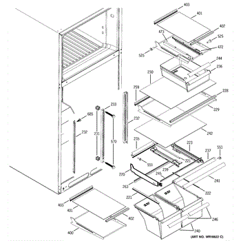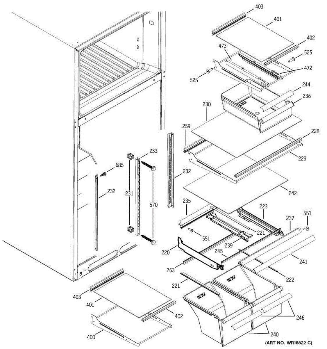 Cantilever side track for refrigerator shelves. Installs on interior wall to support sliding shelf mechanism. Replace if cracked, broken, or worn.