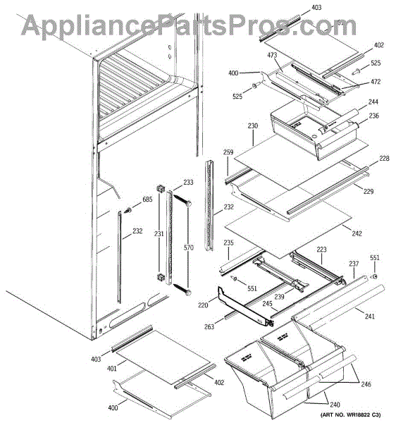 Left side slide rail for refrigerator snack pan or crisper drawer. Replace if broken, cracked, or damaged to restore smooth drawer operation. Sold individually.