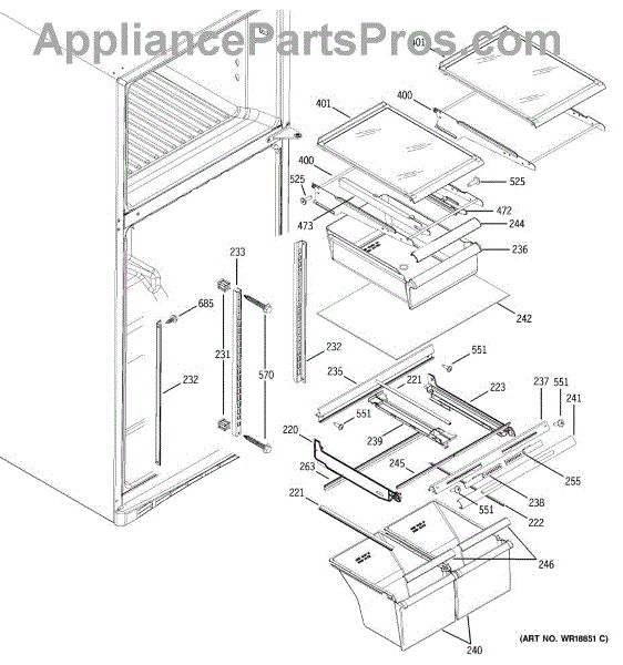 Cantilever side track for refrigerator shelves. Installs on interior wall to support sliding shelf mechanism. Replace if cracked, broken, or worn.