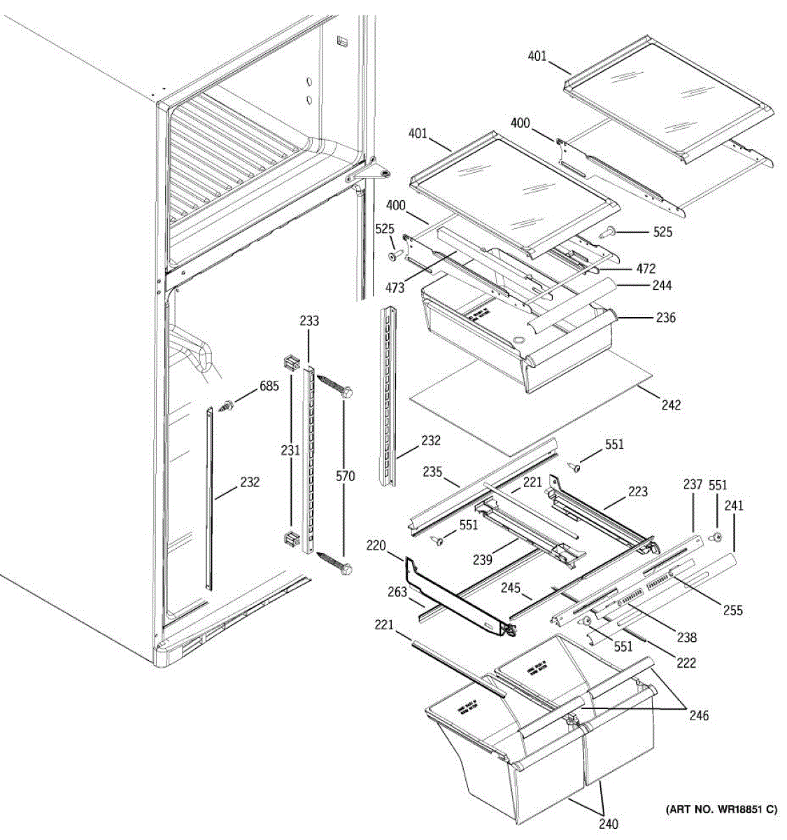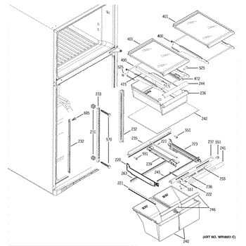 Cantilever side track for refrigerator shelves. Installs on interior wall to support sliding shelf mechanism. Replace if cracked, broken, or worn.