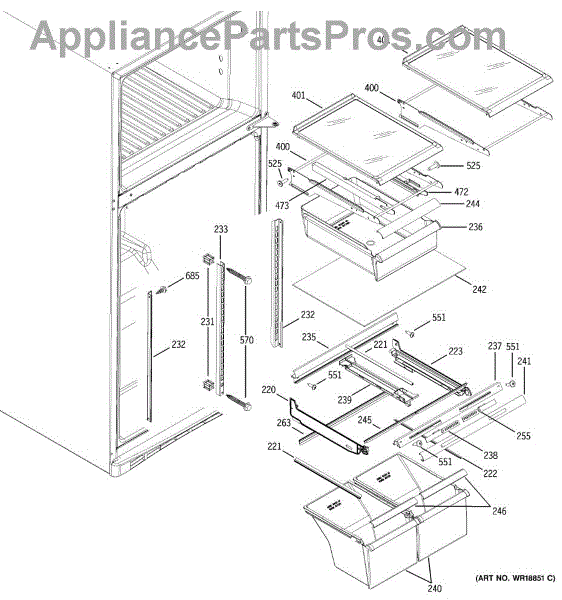 Left side slide rail for refrigerator snack pan or crisper drawer. Replace if broken, cracked, or damaged to restore smooth drawer operation. Sold individually.