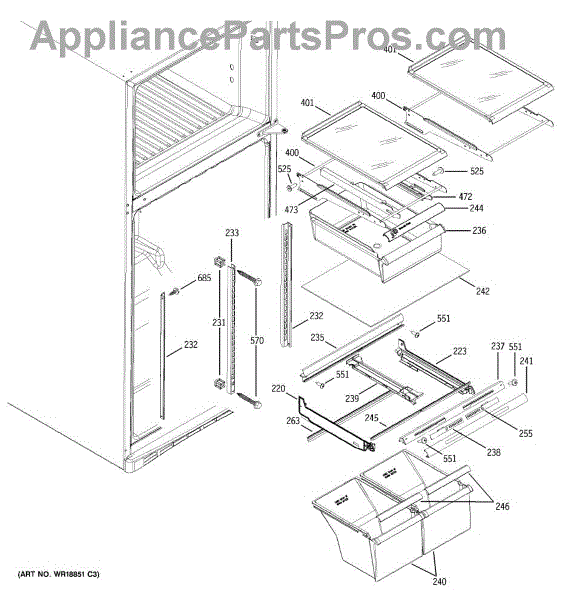 Cantilever side track for refrigerator shelves. Installs on interior wall to support sliding shelf mechanism. Replace if cracked, broken, or worn.