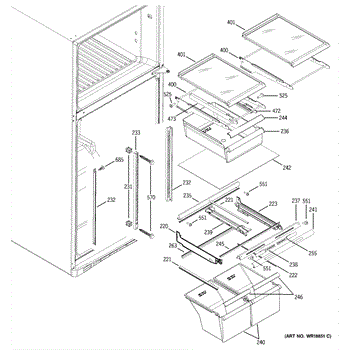 Cantilever side track for refrigerator shelves. Installs on interior wall to support sliding shelf mechanism. Replace if cracked, broken, or worn.