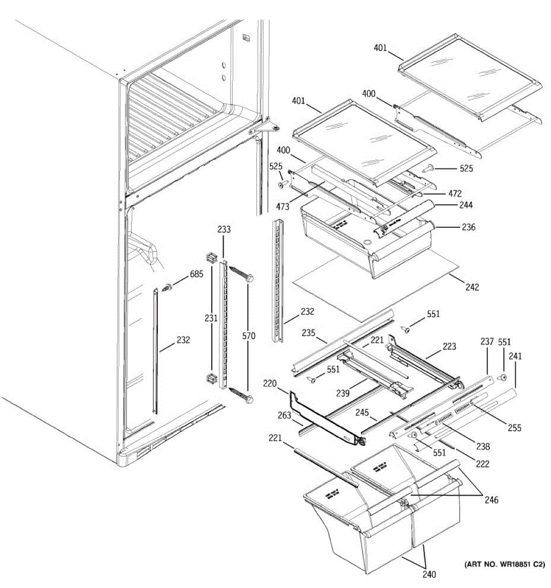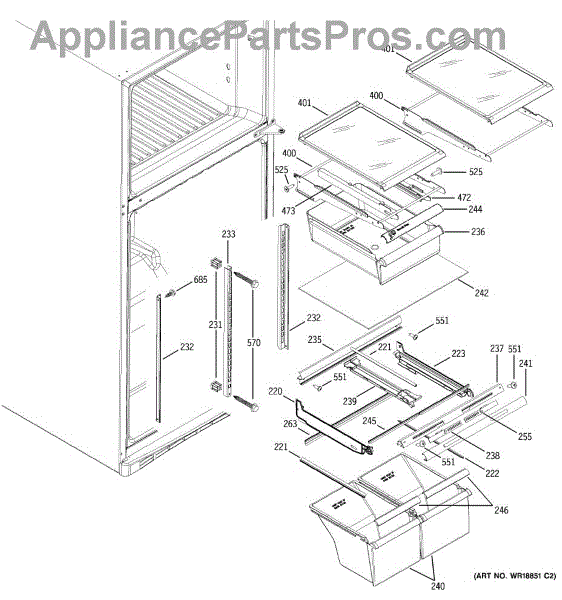 Cantilever side track for refrigerator shelves. Installs on interior wall to support sliding shelf mechanism. Replace if cracked, broken, or worn.