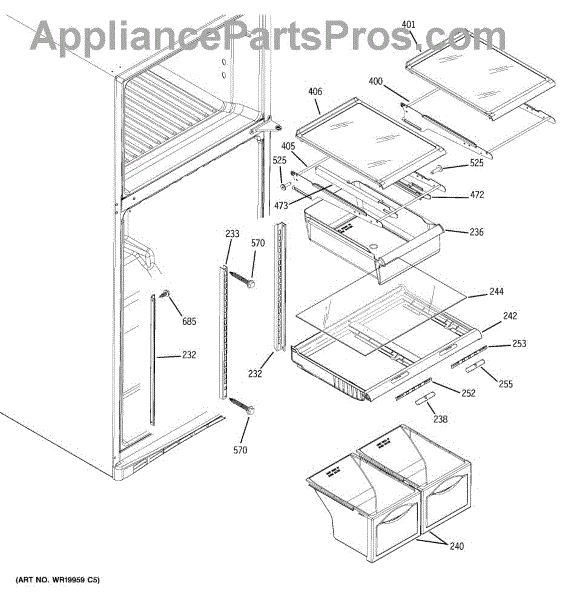 Left side slide rail for refrigerator snack pan or crisper drawer. Replace if broken, cracked, or damaged to restore smooth drawer operation. Sold individually.