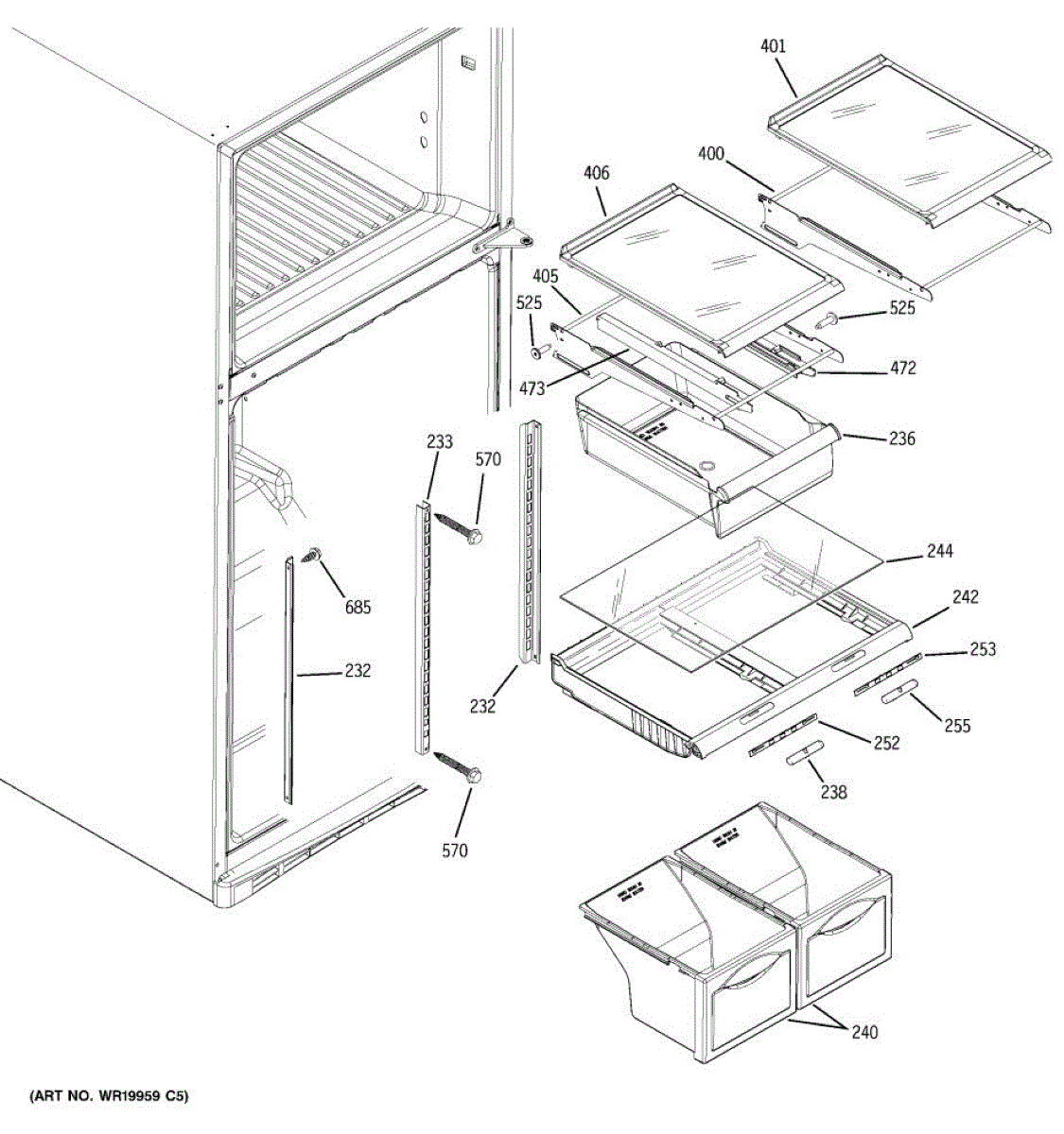 Cantilever side track for refrigerator shelves. Installs on interior wall to support sliding shelf mechanism. Replace if cracked, broken, or worn.