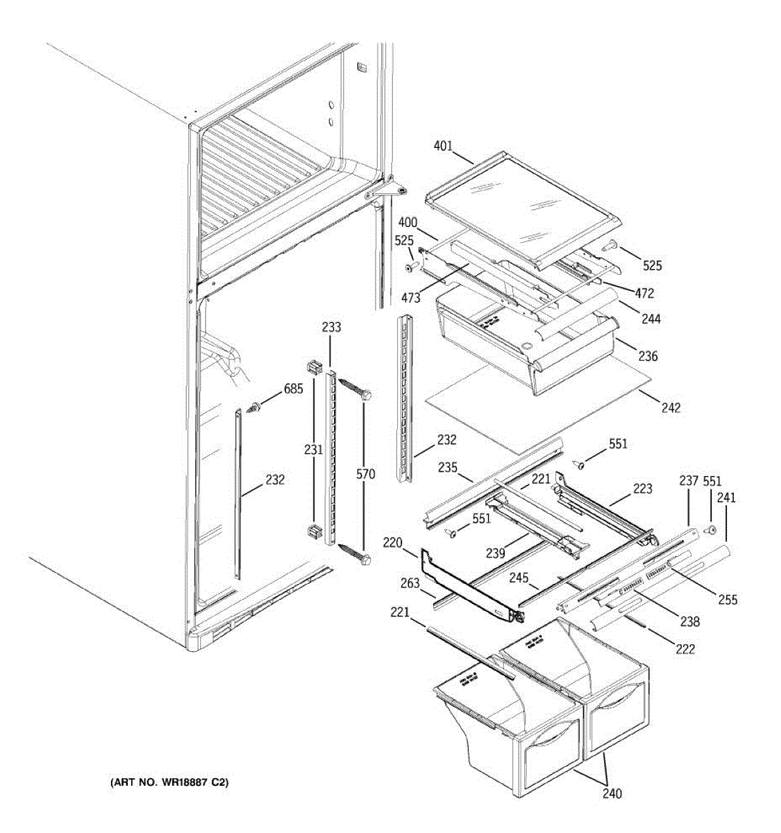 Cantilever side track for refrigerator shelves. Installs on interior wall to support sliding shelf mechanism. Replace if cracked, broken, or worn.