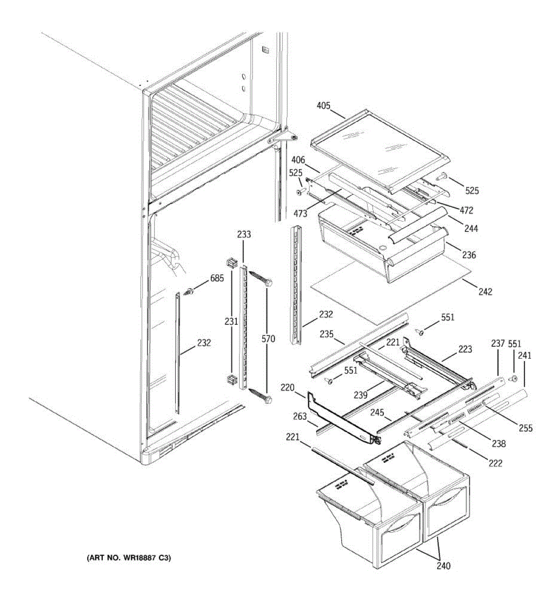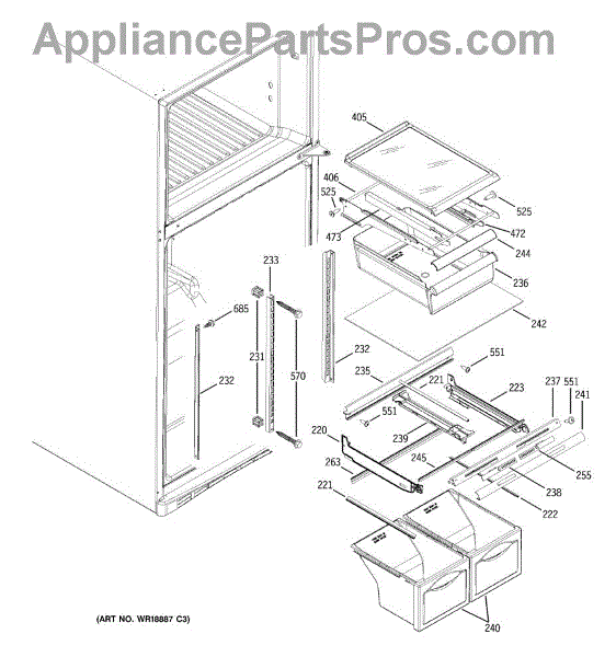 Cantilever side track for refrigerator shelves. Installs on interior wall to support sliding shelf mechanism. Replace if cracked, broken, or worn.